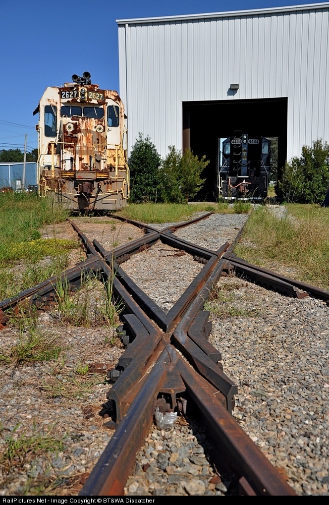 Ex-ATSF 2627 and cousin Ex-ATSF 2480, not pictured, behind 2627, sit on an old industrial track with an unusual design in Clinton, NC. Both Ex Santa Fe's await an uncertain fate. The newly acquired GP9 has just been tied down after an evening of switching.