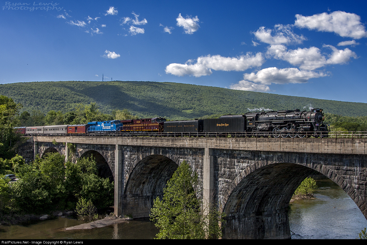 | On one of NS' Memorial Weekend Public Excursions, NKP 765 is seen crossing the concrete arch bridge in Mount Union, PA. |