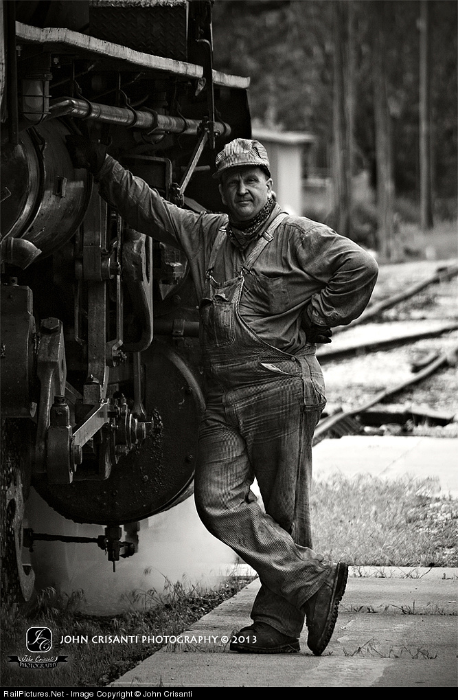 A Boone & Scenic Valley Railroad crew member poses next to a 2-8-2 JS Chinese Built Steam Locomotive that has returned to Boone from Fraser.