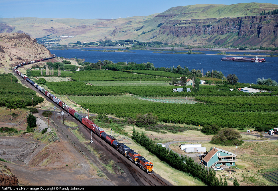 | THE COLUMBIA RIVER GORGE - BNSF glides downhill thru the fruit orchards and vineyards in Maryhill,Wa., while a river tug pushes some barges upstream. |