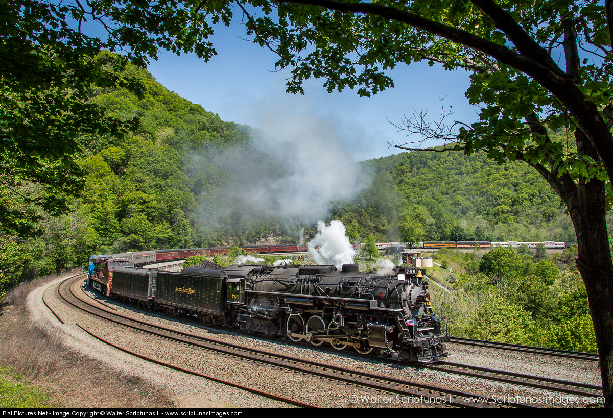 | The Fort Wayne Railroad Historical Society's Nickel Plate Road 765 rounds the famous Horseshoe Curve with the 17 car Horseshoe Curve Special in tow.