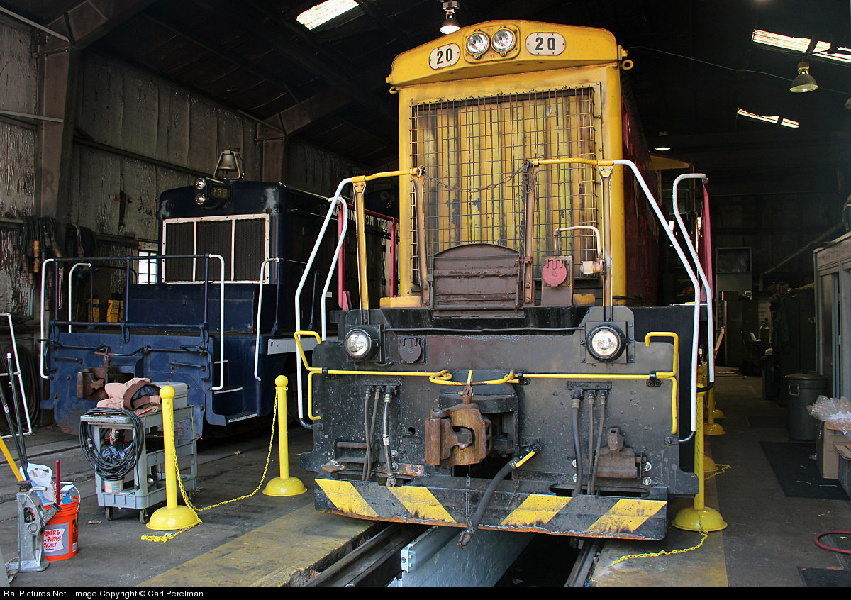 | Sharing the tight confine of the Morristown enginehouse is SW1500 20 and WT SW1 738. The 20 is back from the Bayway Refinery for emergency repair while the SW1 is being prepped for sale. |