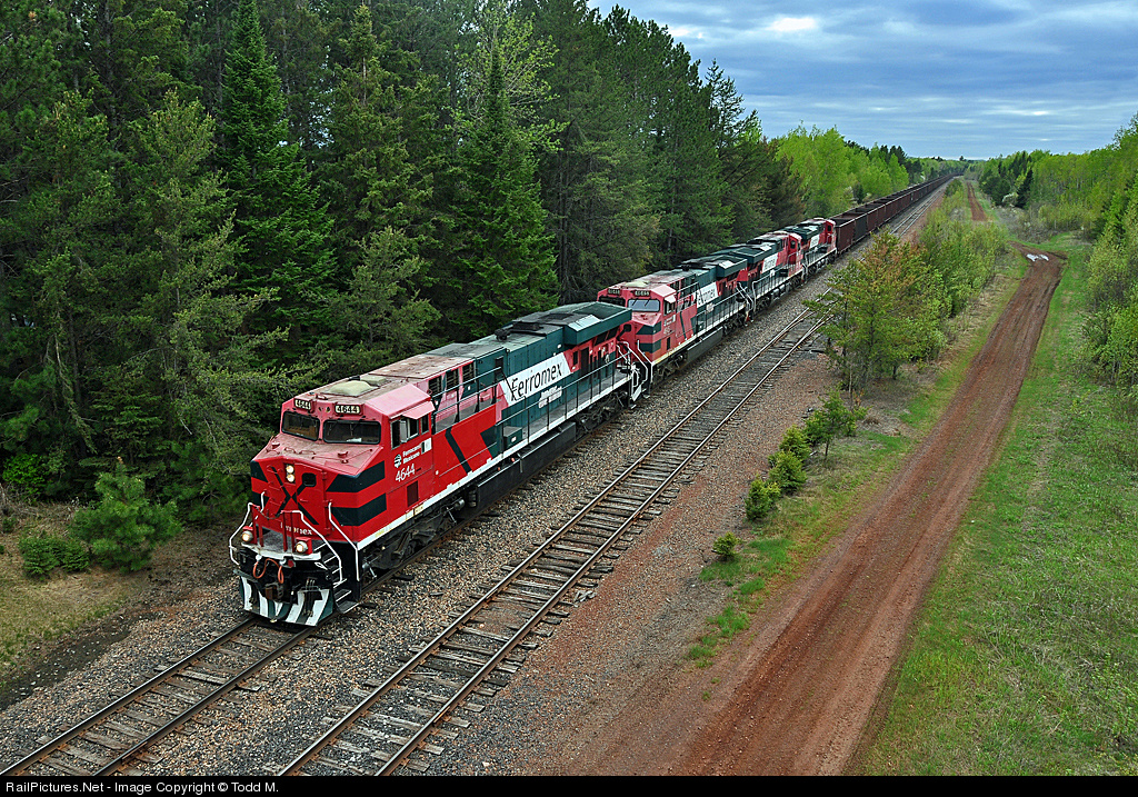 | A very rare visitor to Minnesota's Iron Range and today there were four of them. A quad set of Ferromex GE's charge east at Wilpen, MN with 120 cars for loading at United Taconite's Fairlane plant. The train will load overnight and tomorrow morning before heading back west and then south all the way to Mexico. This is a BNSF train that usually has typical BNSF power but today was different for whatever reason. |