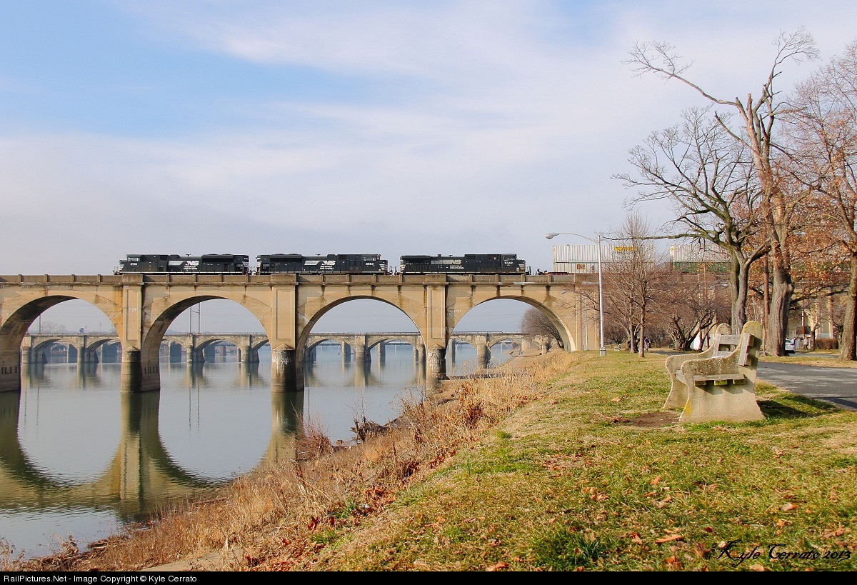 | Norfolk Southern intermodal train 203 crosses the river, and plows out of Harrisburg bound for Atlanta, GA. |