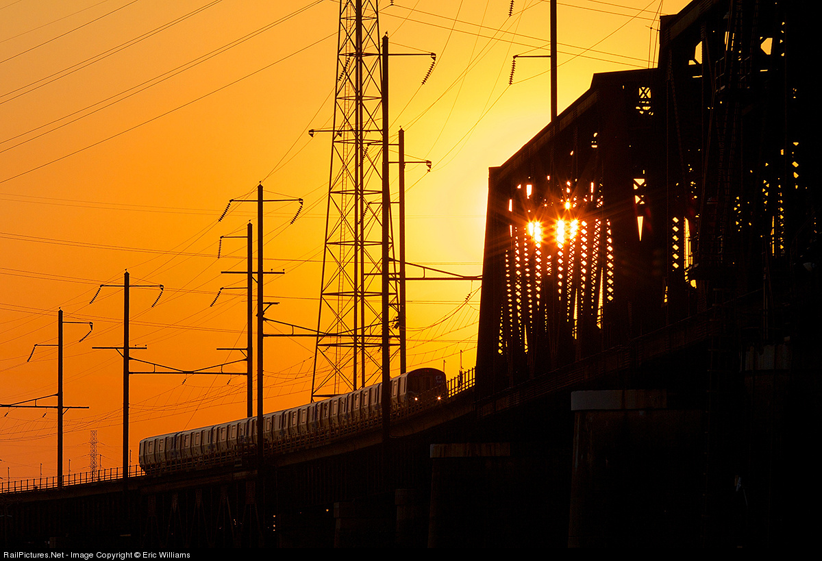 Early summer humidity and haze turn the sky yellow as the sun sets behind the massive PATH Lift Bridge crossing the Hackensack River. This former Pennsylvania Railroad bridge is now owned by and solely used by PATH. While the PRR gave up this bridge in 1961, the overhead catenary remains in place as a reminder of it's original purpose as the passenger line to Exchange Place in Jersey City. The eastbound train uses an outside third rail for power as much of the line has restricted tunnel clearances.