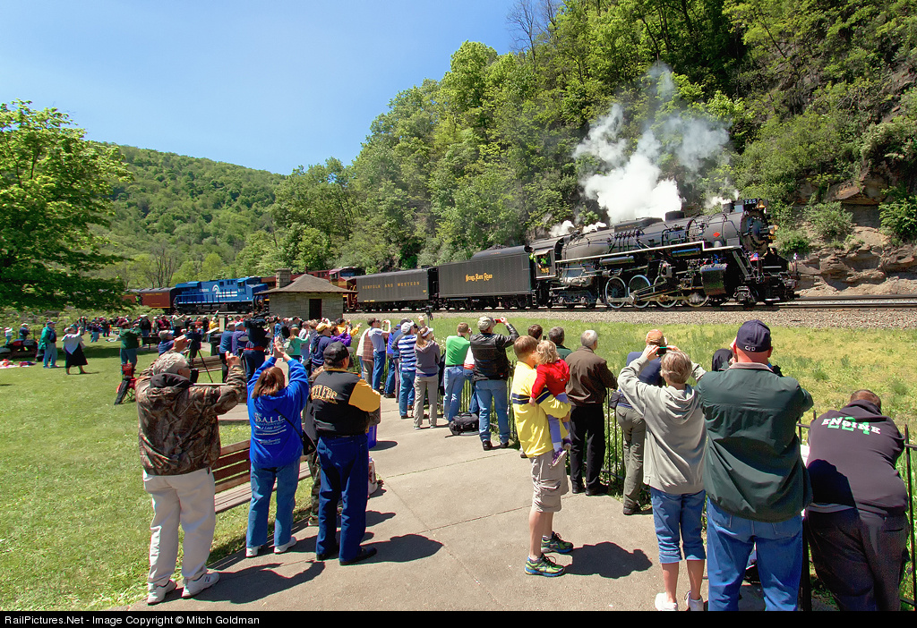 | Eastbound! Easily over a hundred folks from all over and all ages made the climb either by stairs or Funicular to witness Norfolk Southern's steam special operated by the FWRHS. This event took place over a beautiful Memorial Day weekend and is seen here Sunday on the return trip back to Altoona, PA. |