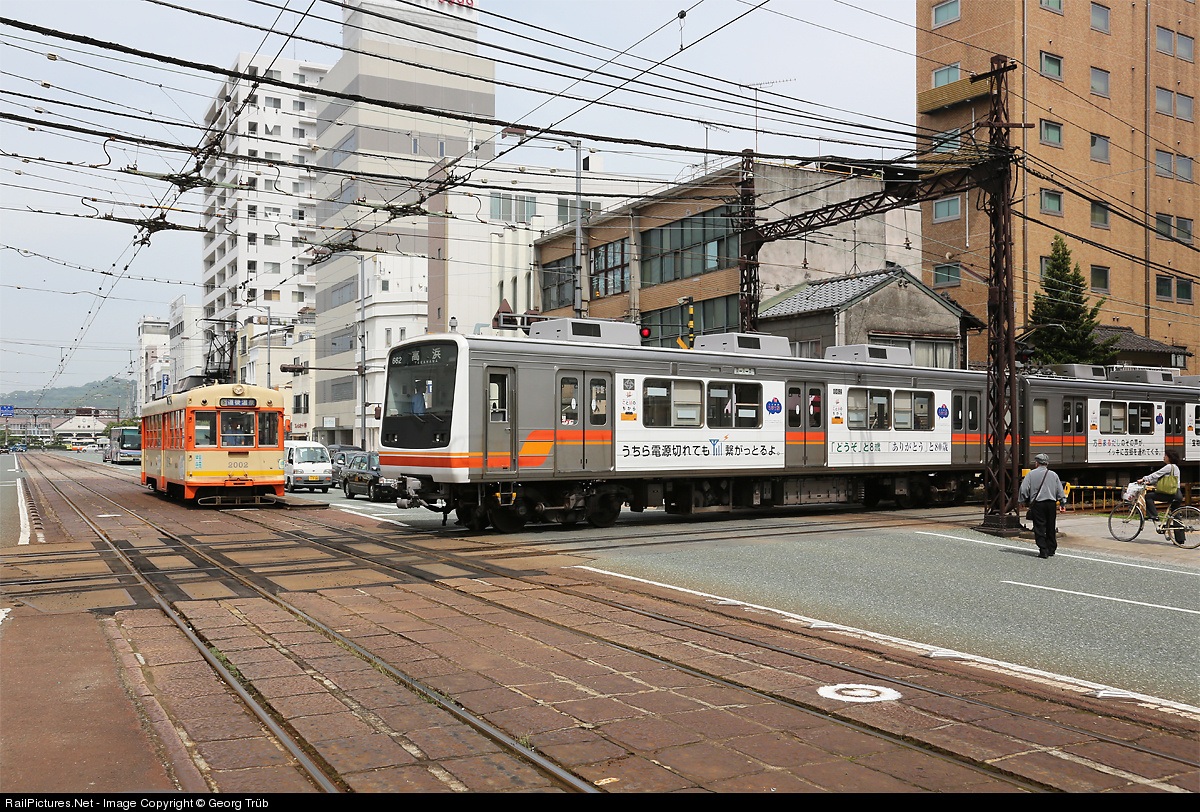 | Streetcar MoHa 2000 series # 2002 from 1964 has to wait on the double track level crossing over the main road, while a 610 series train of the Iyo Railway (Iyotetsu) to Takahama is running in direction of Komachi station. Both vehicles are running on 1067 mm cape gauge and are from the same company (Iyo Railway). |