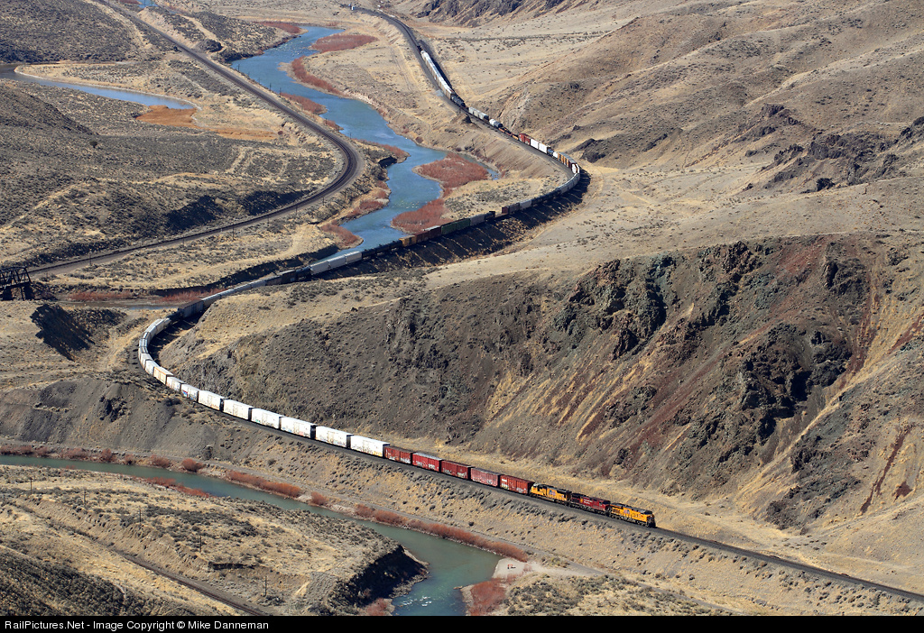 Freight along the Humbolt An eastbound Union Pacific freight traverses Palisade Canyon, Nevada, on Track 2. Both Southern Pacific and Western Pacific built their main lines through here alongside the Humbolt River. Now of course, UP owns them both and uses each directionally, giving it a double-track route through this rugged landscape. That trailing Canadian Pacific locomotive is just a bit out of place geographically!