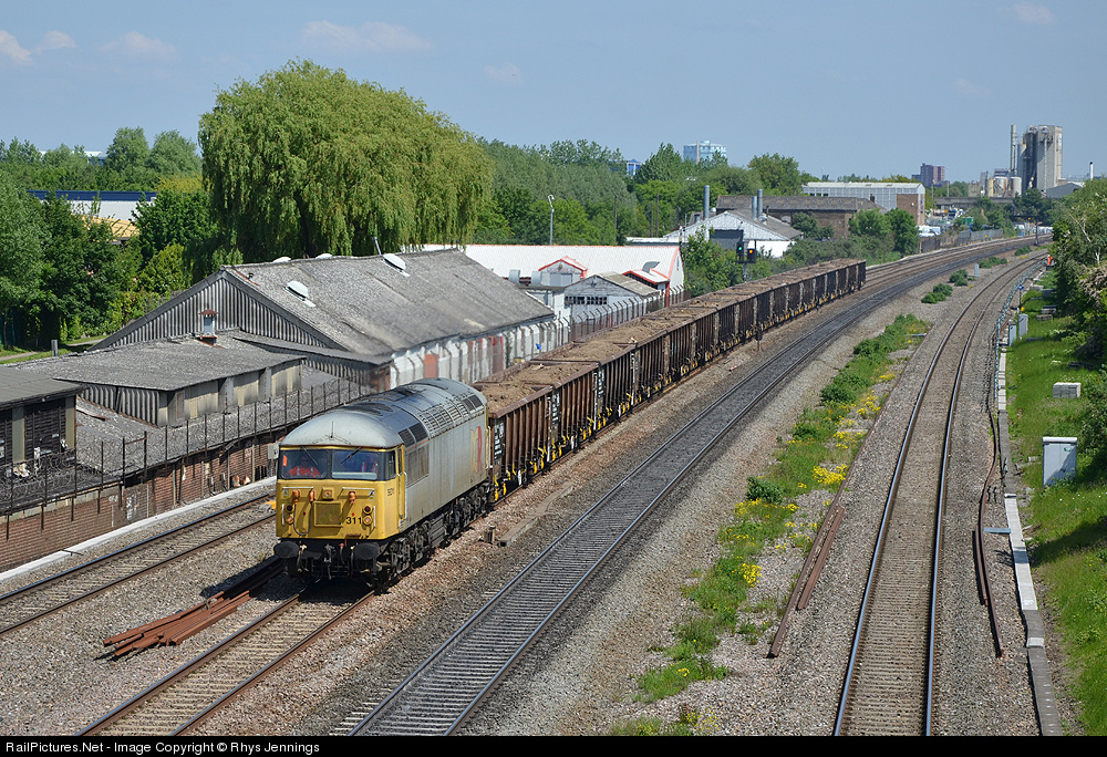 | Over the week commencing 3rd June a new spoil flow was trialled, running from the Thorney Mill stone terminal in South West London to the Calvert Landfill site in Buckinghamshire. Devon and Cornwall Railway Class 56 no. 56311 was used on the trains and is seen here storming towards West Drayton with the second trail run, having run round the train at Hanwell Bridge Loop. |
