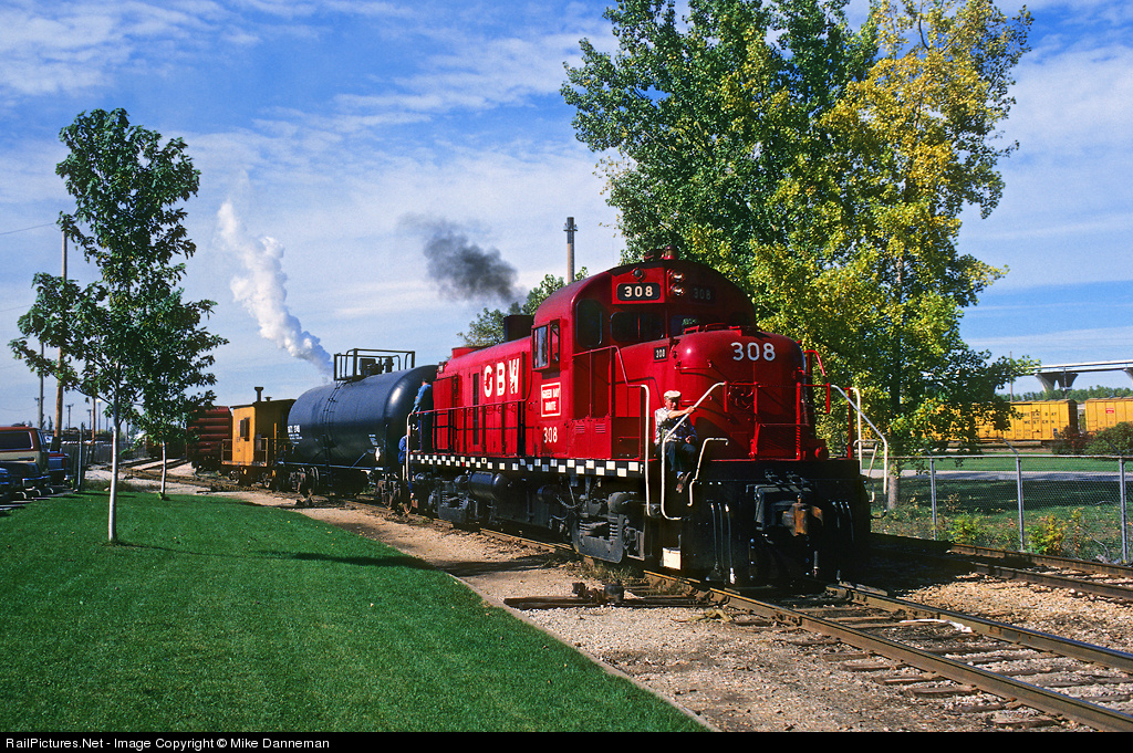 Green Bay and Western RS3u No. 308 switches in Green Bay, Wisconsin, on October 14, 1985. The train is looking much like a model railroad consist; a locomotive, a single tank car, trailed by a caboose. The GB&W labeled these RS3s rebuilt to 2,000 h.p. in the Norwood Shops as RS20s