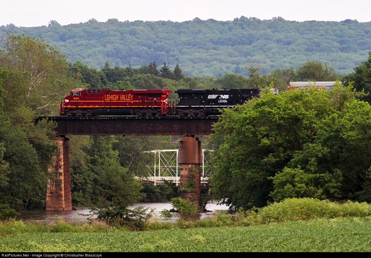| LV heritage on LV. After following the reports of eastbound autorack train 18N's movements all day, I struggled to find a well-lit EB in the afternoon shot on the NS mainline across New Jersey. I settled on the Raritan River bridge in Neshanic Station and was able to catch a Lehigh Valley painted locomotive leading a freight train over the Lehigh Valley bridge for the first time in decades. |