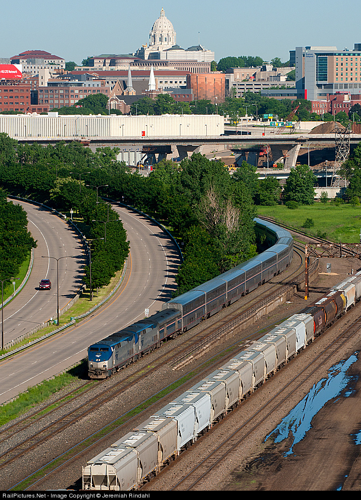 | The eastbound Empire Builder gets ready to leave Minneapolis/St. Paul in its dust after its Minneapolis stop. But before doing so, it passes some pretty spectacular views as seen from high atop Daytons Bluff. The Minnesota Capitol building can be seen in the background. |