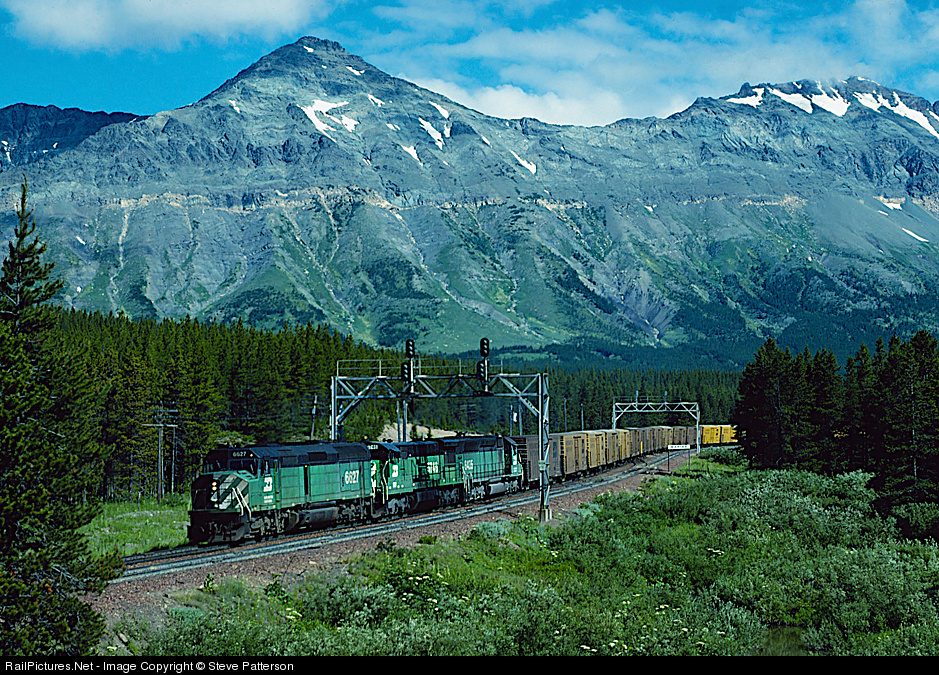 An old favorite photo spot for many, this one was taken July 12, 1978 when BN's Marias Pass still had signal bridges and crossovers. A F45, a GE U boat and a SD45 lead reefer Train 97 westward off the Pass as they skirt the southern edge of Glacier National Park in Montana.