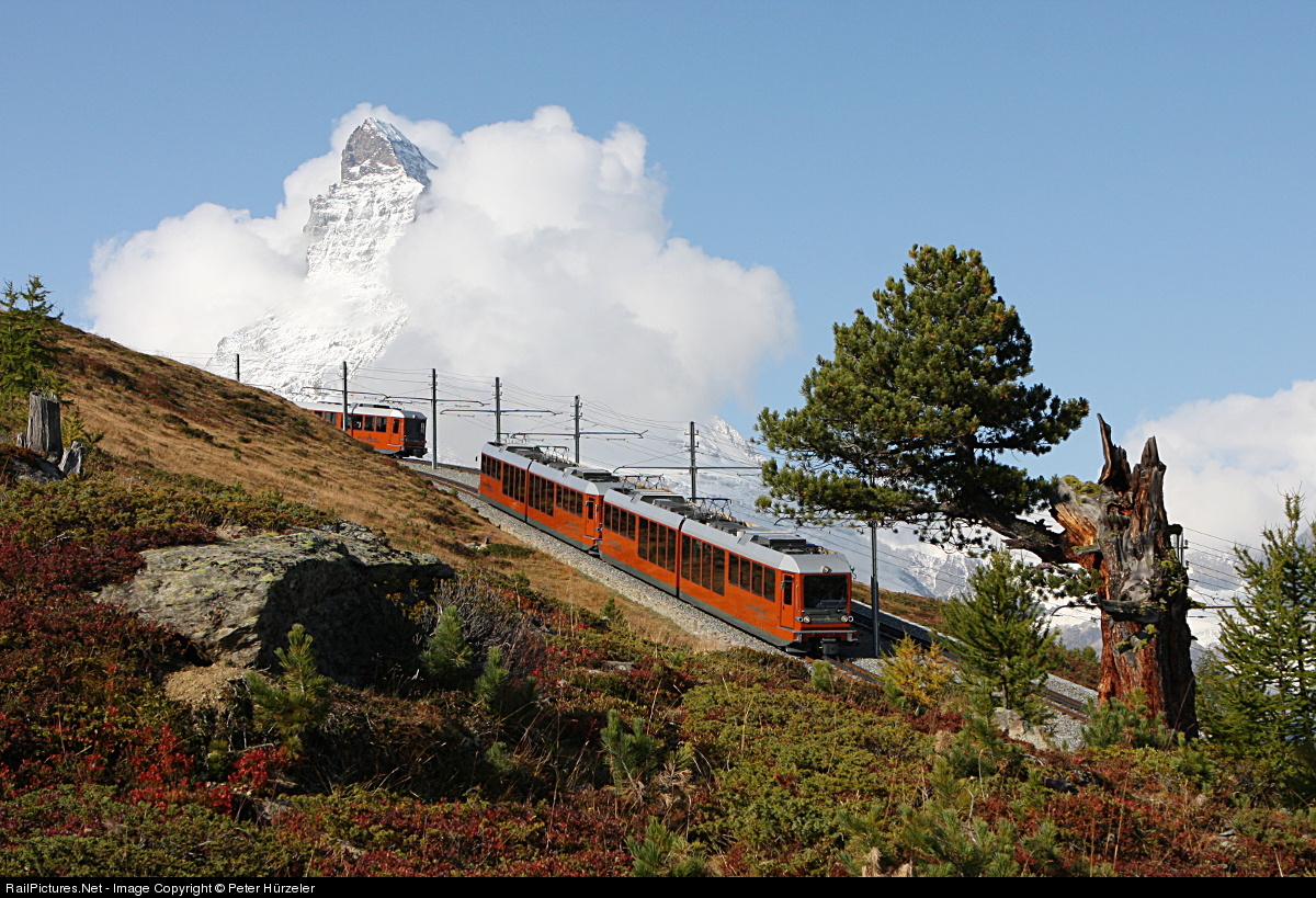 | The mystic Matterhorn was on this day even more mystic with this all the time wafting clouds around the peak. Two of the newest Bhe4/6 type EMU are descending to Zermatt while the other two are just rounding the corner on their climb to the 3135m (10285ft) high Gornergrat peak. |