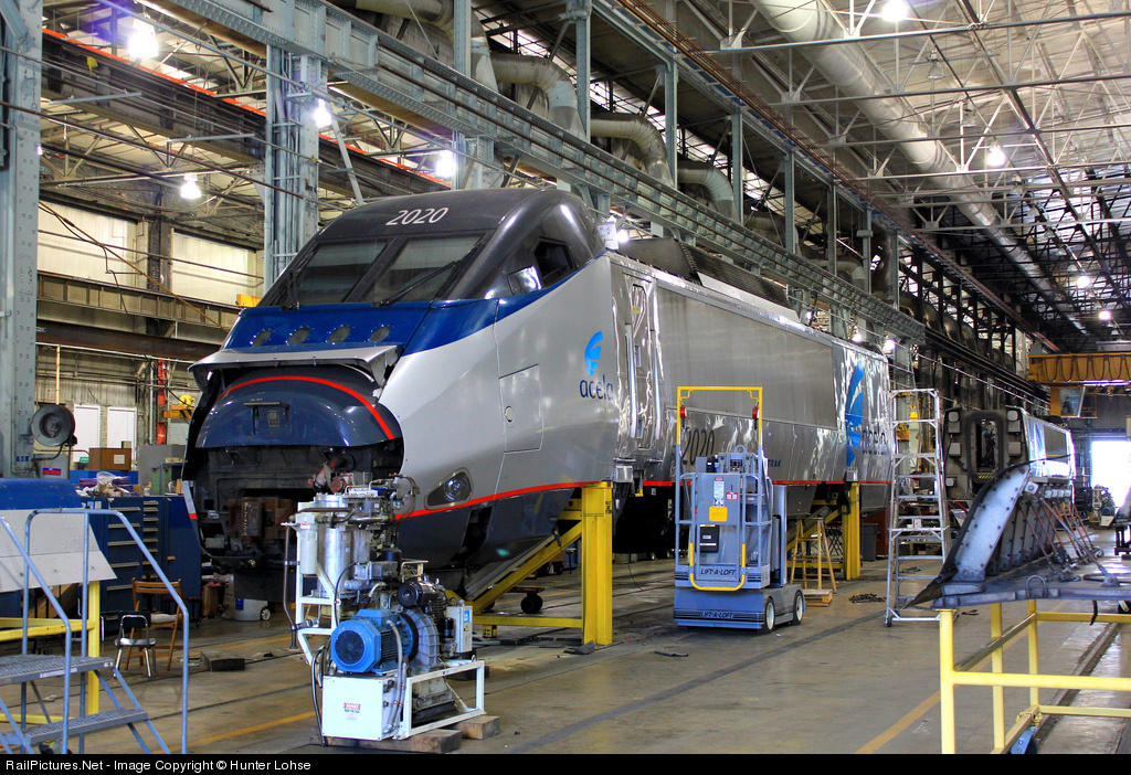 An Amtrak Acela Set gets serviced at the Wilmington Shops