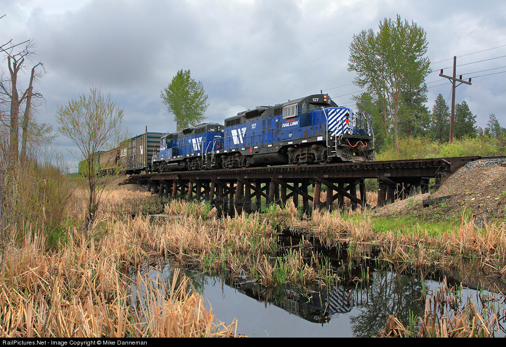 Montana Rail Link’s Bitterroot branch (also known as the Darby branch) local passes over some backwaters of the Bitterroot River north of Florence, Montana, on May 18, 2013. This line had high water and washout problems in the spring of 2011, and MRL filed notice of intent to discontinue service on the line later that year. In spring of 2012, the railroad worked out an agreement with Ravalli county and shippers on the line to resume operations. Currently, the branch operates on Saturdays using the Paradise local’s power when it returns to Missoula for weekend servicing. Here, MRL GP9 Nos. 127 and 113 bring the train of two loaded hopper cars, separated by two empty boxcar “idlers,” for the current end of the branch at Victor.