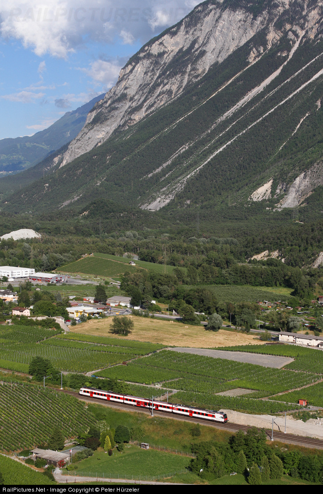 | The Valais valley is know for its wines - but also for its spectacular shape. A deep cut in the mountains - made by the once big Rhone glacier. On the bottom the simplon mainline is running through the vineyards. Here a RBDe560 regionaltrain is heading for Sierre/Siders. |