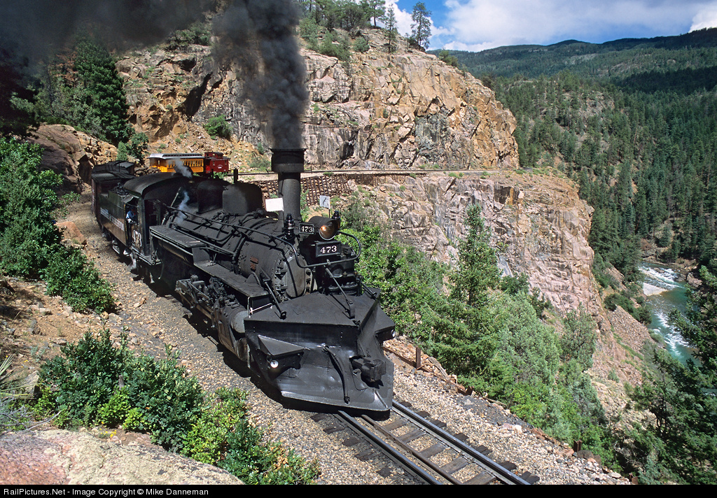 A Durango and Silverton mixed freight treads slowly along the steep cliffs high above the Animas River east (south) near Rockwood, Colorado, on August 24, 2005. Outside-frame Mikato 2-8-2 No. 473 powers the train, which included some freight cars, a coach and short caboose No. 0500.