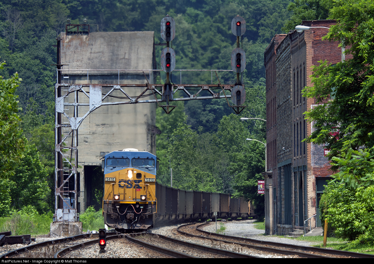 A pair of CSX loco's easily handle this train through the middle of Thurmond WV and under the classic C&O signals. This scene has played out for over 100 years and soon the C&O signals will give way to the newer modern signals changing this scene forever. Thurmond was a classic boomtown. With the huge amounts of coal brought in from area mines, it had the largest revenue on the Chesapeake & Ohio Railway. Having many coal barons among its patrons, Thurmond's banks were the richest in the state. Fifteen passenger trains a day came through town-its depot serving as many as 95,000 passenger's a year. The concrete coal tower and classic C&O station still remain along with the buildings pictured. This is definitely worth the drive and deserving of a return visit. Please note. Taken from a public RR Crossing with telephoto zoom lens. NOT standing in the gauge.
