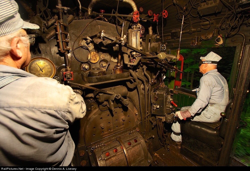 The are few places that are more insane or awesome as a moving steam locomotive cab. It is made of antique metal, crazy appurtenances, an inferno inches away, dirt, banging plates, clanking chains, screaming whistles, and a large bomb (the boiler) ready to kill you if you do not do your job right. There is no place more exciting in the world for me. Here Fireman Don Young has the pressure pegged and Engineer Dick Roden is all concentration running a Scranton PA to Moscow excursion with Canadian National 2-8-2 No. 3254.