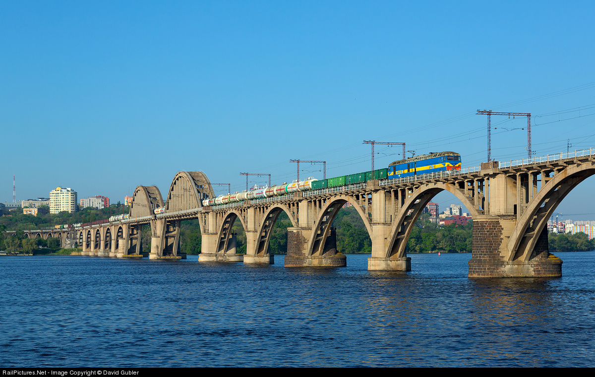 A freight train takes the by-pass from Dnipropetrovsk south to Nizhnedneprovsk, which crosses the Dnieper river over this impressive viaduct.