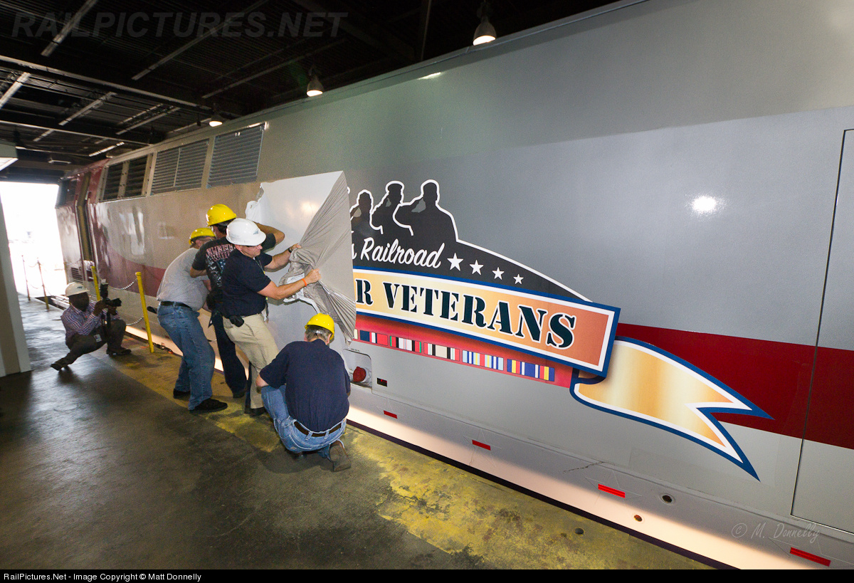 The masking on the Amtrak Veteran's unit is carefully removed by employees to reveal the custom logo (designed in-house) that features silhouettes of service members, service ribbons for all modern conflicts, and proudly reads "America's Railroad Salutes Our Veterans." For a video of the painting of this special locomotive, Click Here