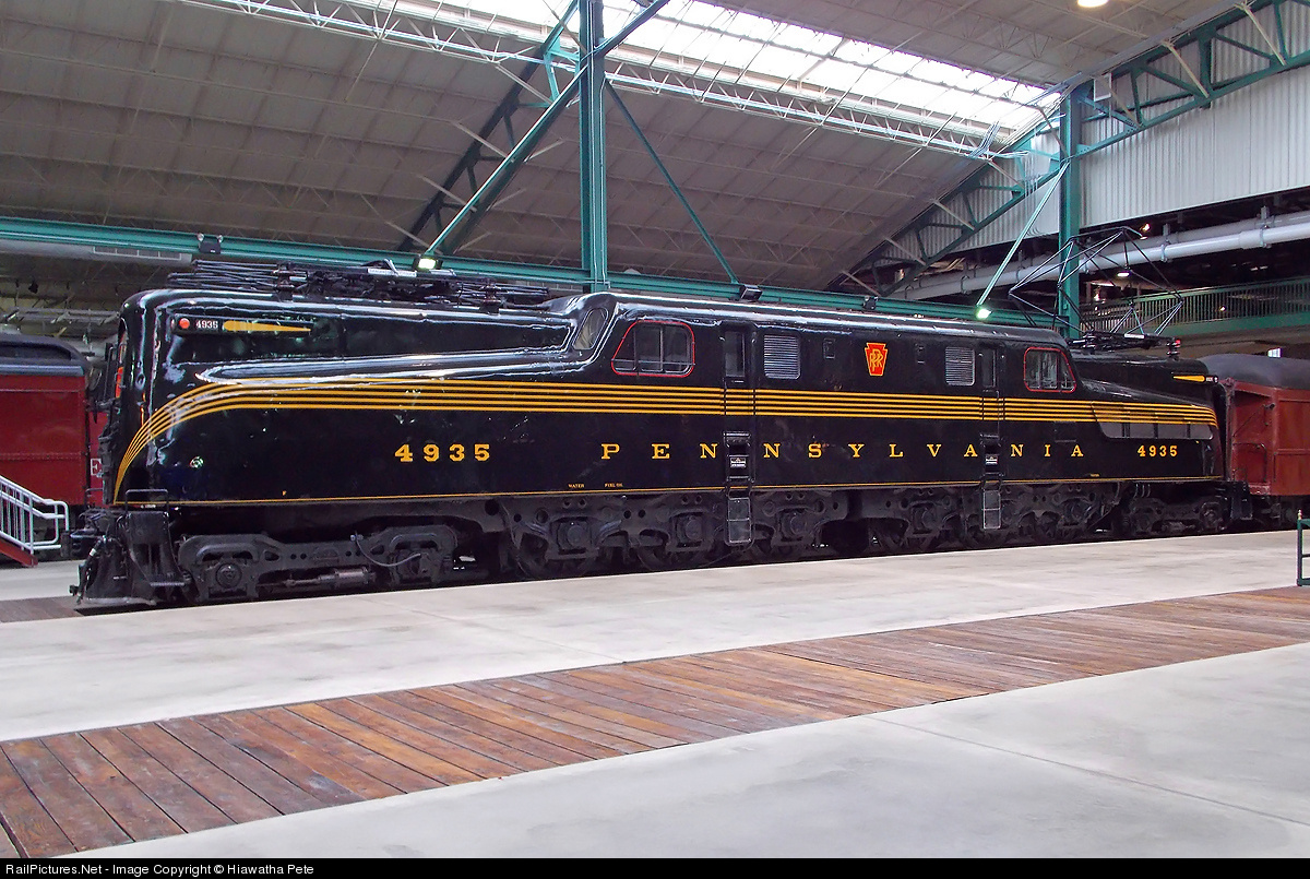 Pennsylvania Railroad class GG-1 2-C+C-2 electric #4935 on display at the Railroad Museum of Pennsylvania, Strasburg, PA. With it's streamlined welded body styled by industrial designer Raymond Loewy, 100mph capability and 4,620 continuous horsepower, this is the unmistakable symbol of North America's largest railroad electrification. For more pics & videos from my collection see my website at http://northamericabyrail.info/