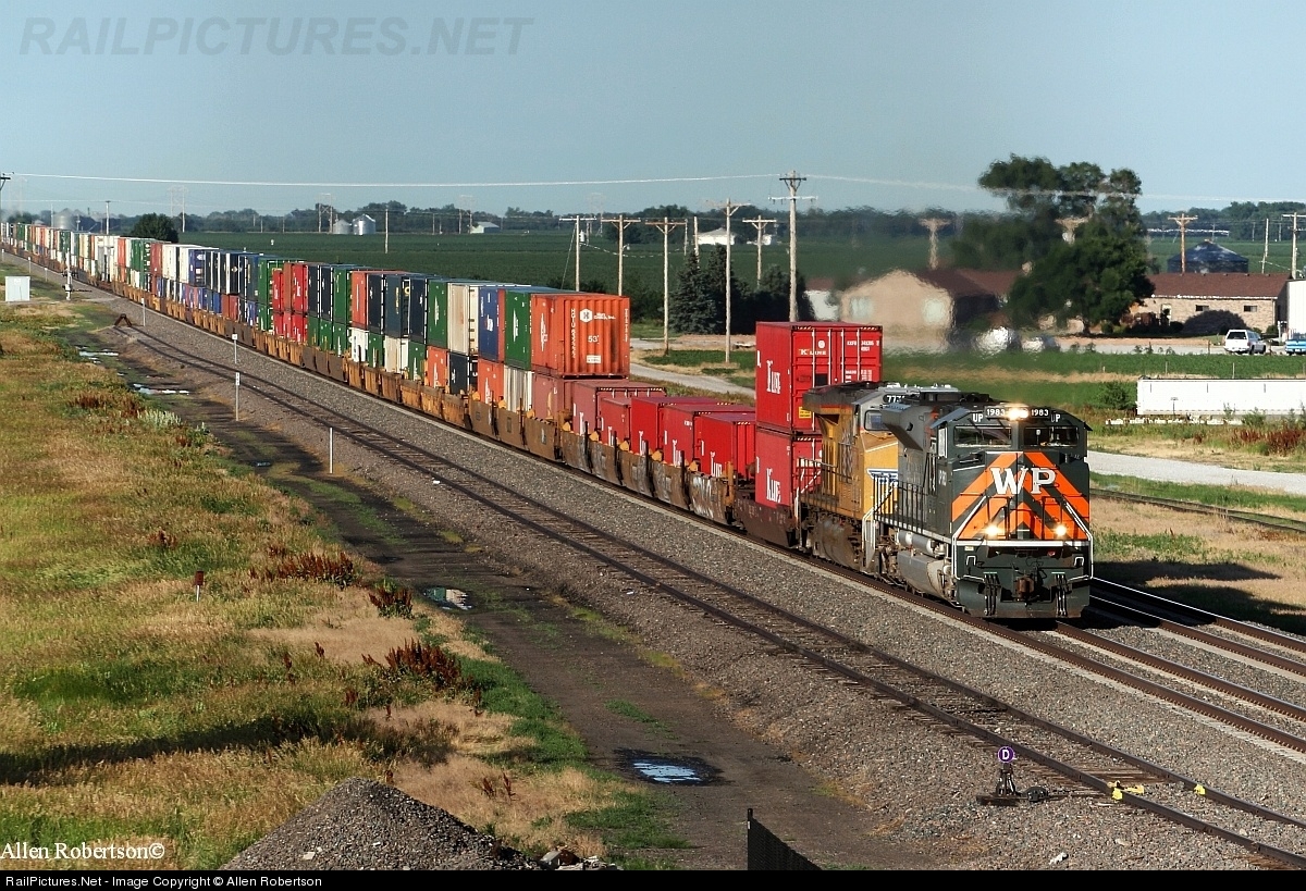 UP's Western Pacific heritage unit leads a westbound stack train through Wood River NE.