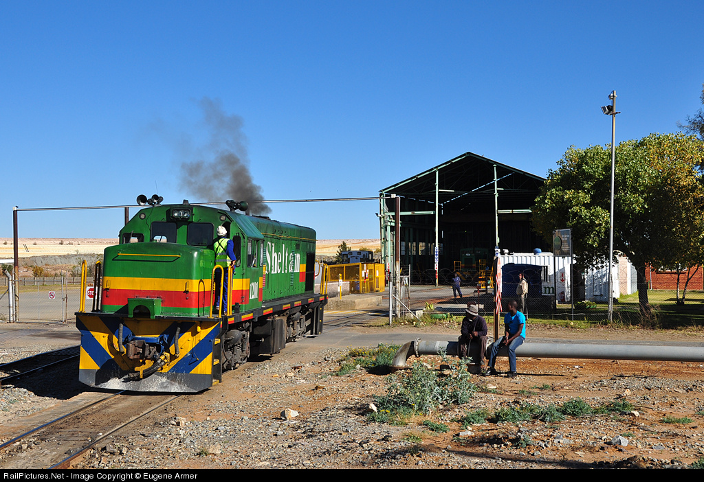 The first General Electric diesel-electric locomotives ordered by the South African Railways (SAR) were the class 31 (GE U12B), imported from the USA and placed in service in 1958. All have been withdrawn, but a few examples survive in industrial use with private operators, such as this one owned by Sheltam. From their depot at Saaiplaas, near Virginia, Sheltam operates the eastern end of the Harmony Gold system. A couple of passersby take a breather and watch as No. 1201 (ex- SAR 31-038) departs from the small depot at the beginning of the afternoon shift. The original high short hood has been replaced with a chopped nose. Photo taken with permission during Tanago's recent South Africa tour.