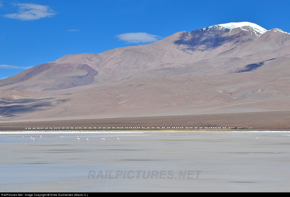 | Flamingos and the Railroad: In the middle range of the Andes, 4000 meters above sea level, this train of the railway company FCAB through the huge and impressive "Salar de Ascotan" (Salt flats) on his way to the town of Ollague and the border with Bolivia, surrounded by volcanoes and a great number of flamingos feeding on one of the lagoons of salt. |