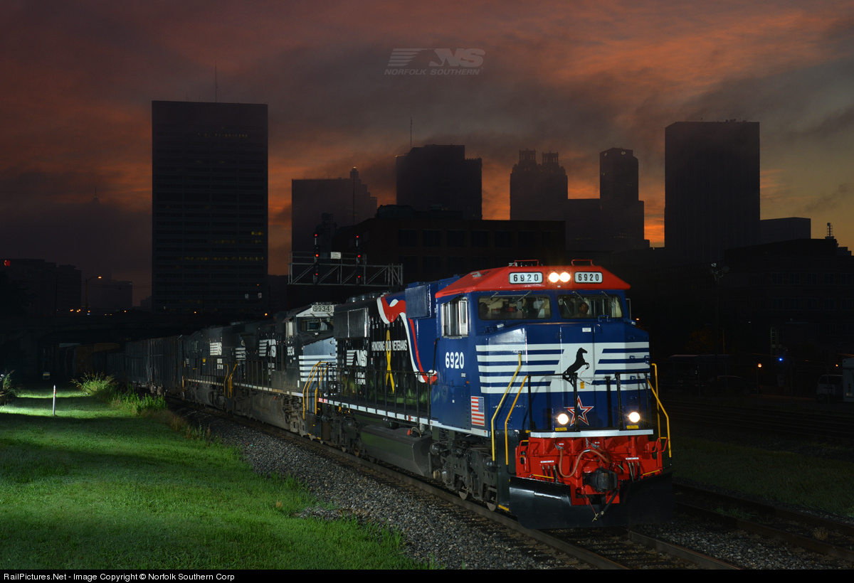 The downtown Atlanta skyline is silhouetted by a humid summer morning sunrise as train 119 makes its way through town. Leading the way is the Veteran's unit: SD60E #6920. 119 operates daily between Linwood, NC, and Macon, GA. Photo by Casey Thomason. For more information, visit www.nscorp.com