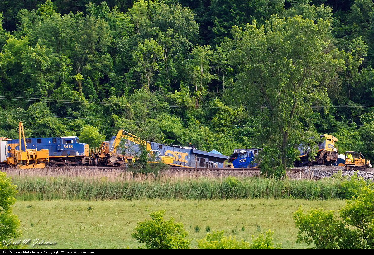 Crews have been working around the clock to clean up a wreck involving two trains on the CSX Tranportation Mohawk Subdvision that occured just before 08:00 hrs on June 27th. The actual cause is still under investigation. However, at this point, this much is clear, the west bound Q641 was proceeding through CP 188 with a limited clear signal crossing over from track 1 to track 2. The east bound Q364 had been calling clear signals up to automatic 193. They were not heard at auto 190. Shortly after the Q641 began to crossover, at which point the Q364 ran into the side of the train causing the derailment. CSXT engines 4759, 7732, 5394, and 5418 were on the Q364 all went on the ground. Numerous other railcars were strewn about the scene as well. The power on the Q641 was not directly involved in the incident and remained on the tracks. Fortunately, for everyone's sake, only minor injuries were reported for two of the crew members.