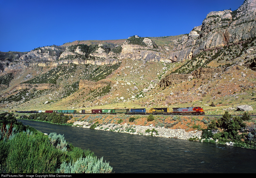 A westbound Burlington Northern Santa Fe freight is in scenic Wind River Canyon at Dornick, Wyoming, on July 8, 1999. Leading the train is warbonnet GE C44-9W No. 793, with two EMD SD40-2s trailing, one a former Santa Fe, and the other an ex-Milwaukee Road, now EMD Leasing.