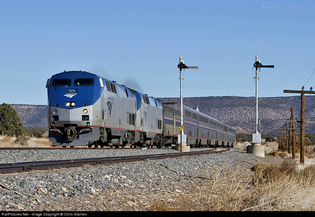 | Amtrak's Westbound Southwest Chief passes the classic semaphores at the east end of Chapelle siding on a beautiful day in the high desert of northern New Mexico. |