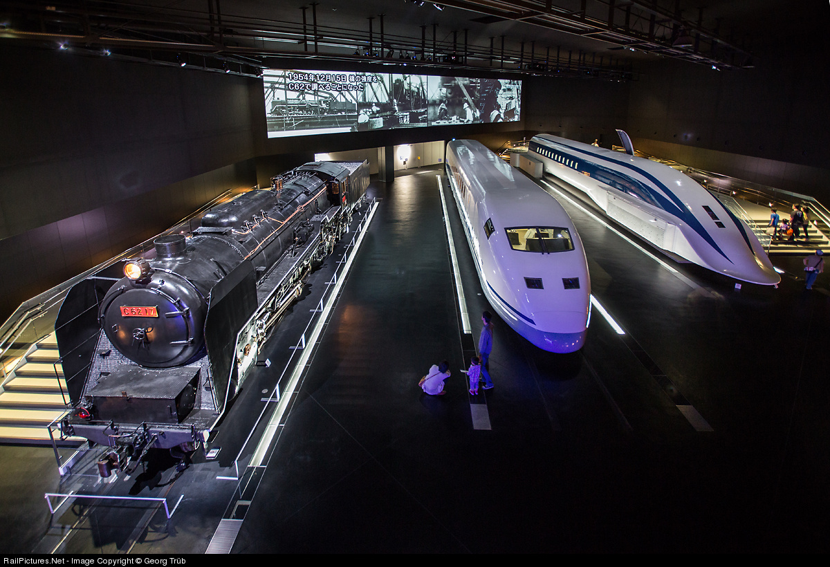 The large entrance hall of the SCMaglev and Railway Park shows three outstanding exhibits, each demonstrating japanese speed records. From left steamlocomotive C62 17 which reached 129 km/h on cape gauge in 1954, in the middle electric test vehicle 300X of the 955 class, which reached 443 km/h in 1996 on the standard gauge, and on the right super conducting magnetic levitation train MLX01, which reached 581 km/h in 2003 on the Yamanashi Maglev Test Line.