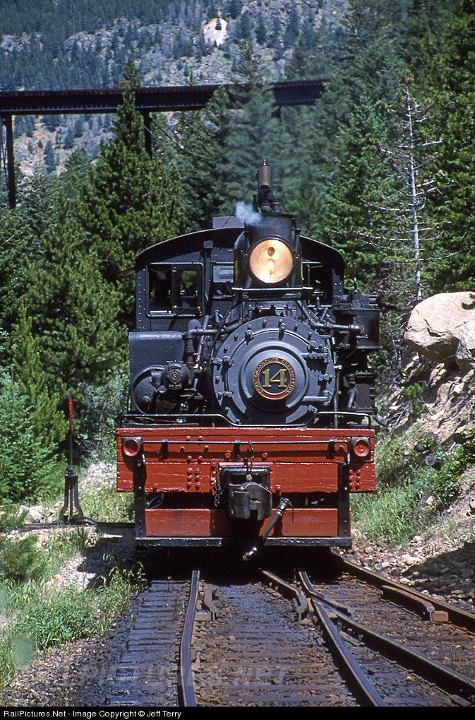 | No. 14 backs down towards the Devils Gate Viaduct. After passengers have the opportunity to see the bridge, it will reverse direction and head towards Silver Plume. |