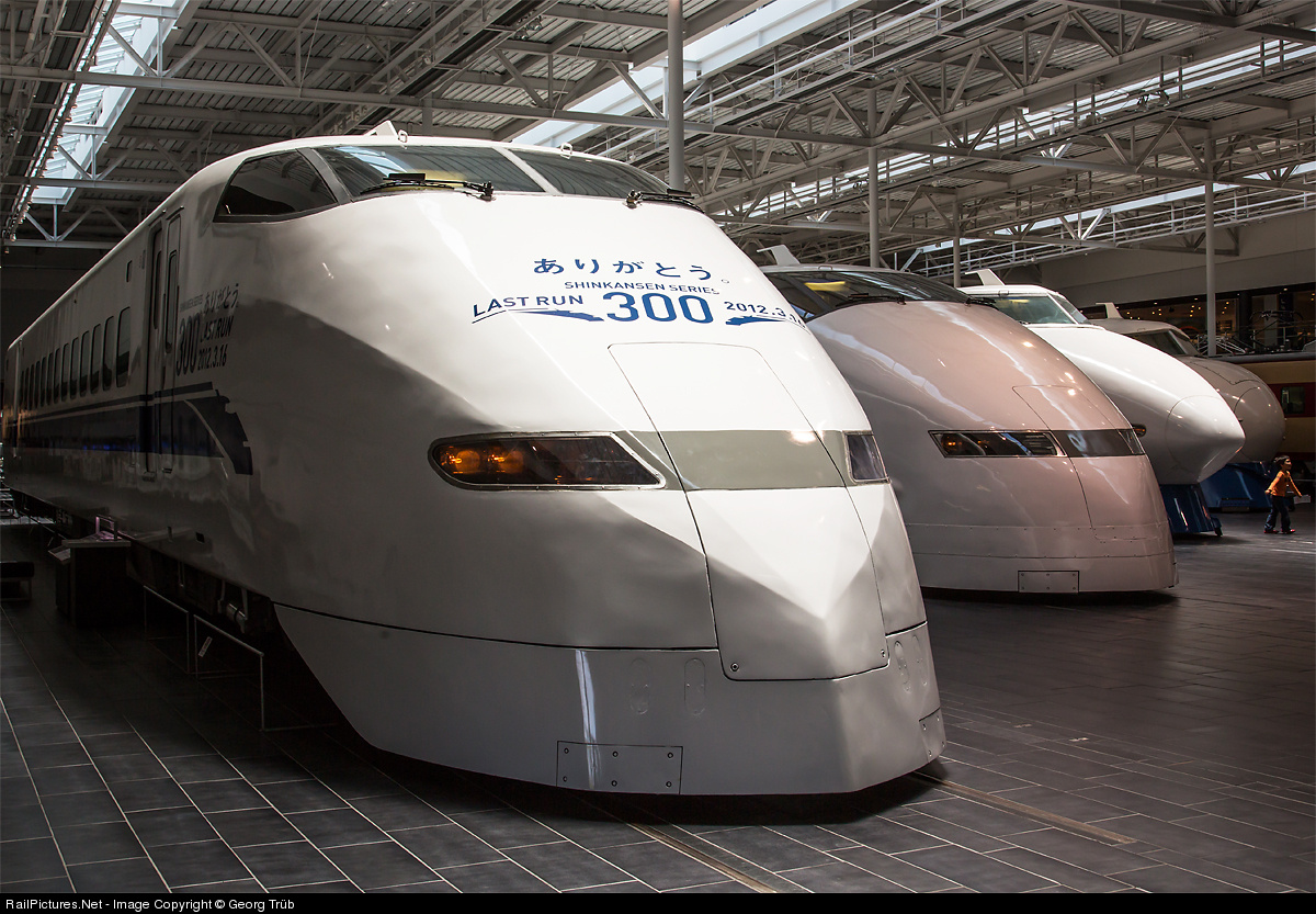 Even the third generation of Tokaido-Sanyo Shinkansen trains are scrapped or museum exhibits now, the 70 trains of the 300 series, built from 1990 to 1998, capable for 270 km/h. Some were in service for about 15 years only, the last run was made on march 16th, 2012, with this trainset (endcar). In the background other endcars of 300 series, 100 series and 0 series.