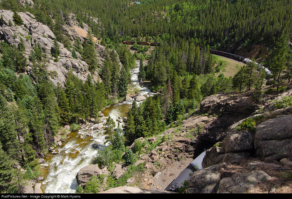 An empty coal train begins to round the 12-degree horseshoe curve just east of Pinecliffe. The cut behind the train is the site of daylighted Tunnel 28. South Boulder Creek flows in the foreground.
