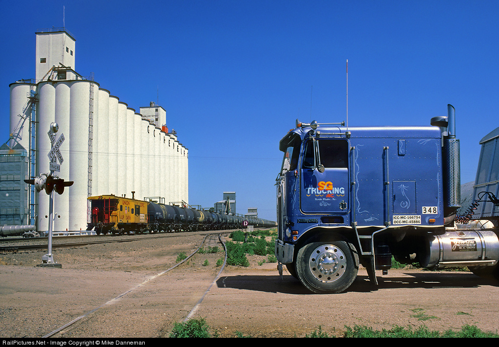 A grain truck at Gothenburg, Nebraska, waits for an eastbound Union Pacific train to clear on July 3, 1986. Class CA-13 caboose No. 24516, a bay window car acquired from the Rock Island, trails the train past the elevators.