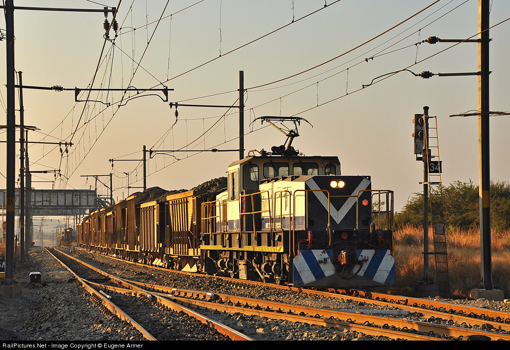 | Impala Platinum is the worlds second largest platinum mine and operates an extensive electrified (3kV DC) rail system serving 14 shafts. Class 8E Bo-Bo electric #3 basks in the early morning light while waiting for clearance to unload its train of 12 hoppers. Photo taken with permission on Tanago's South Africa tour. |