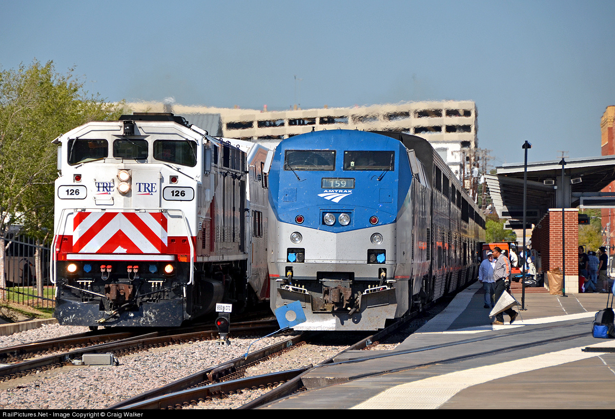As Amtrak train #21, the Chicago IL to San Antonio TX Texas Eagle is serviced in Fort Worth, Trinity Railway Express commuter train #2923 (Union Station [Dallas] to T&P Station [Fort Worth]) accelerates out of the city's ITC (Amtrak, TRE, Greyhound and transit bus) station on October 17, 2011. TRWX F59PH 126 was recently rebuilt, repainted and renumbered. Originally owned by Toronto's GO Transit, the engine was later sold to TRE, where it retained its original number - 568.