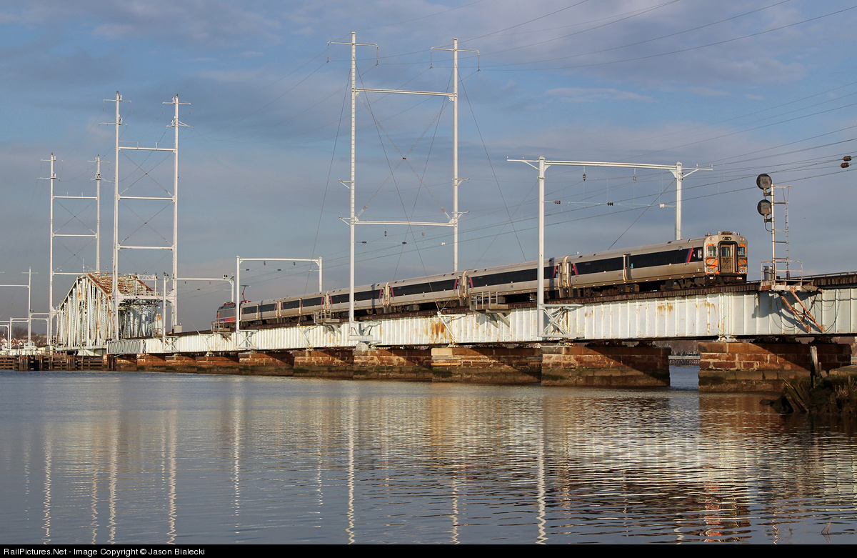 An afternoon commuter train passes over the Raritan River Drawbridge on a tranquil and sunny winter day.