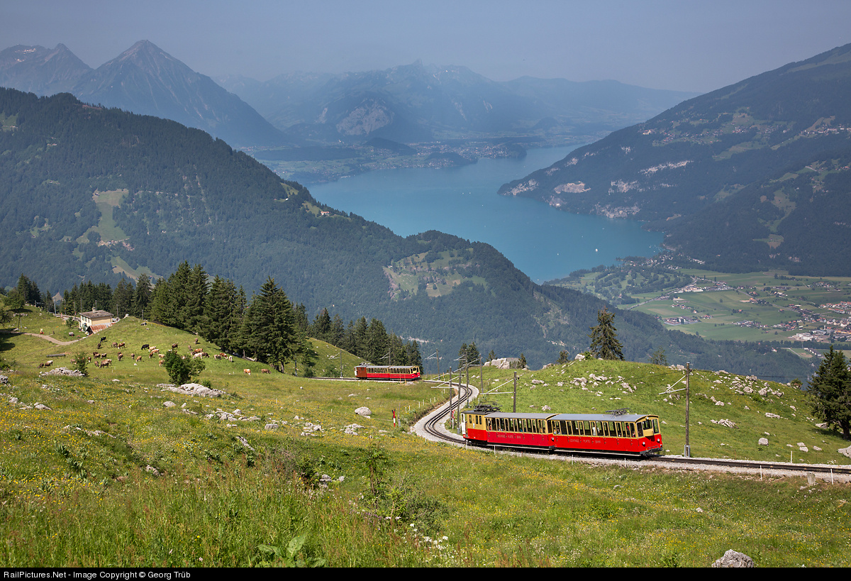 | The two compositions forming train 642 above Breitlauenen crossing station, which is visible on the left, with Thunersee and Niesen mountain (the pyramid on the left) in the background. Locomotives are He 2/2 # 14 (1914) and # 20 (1911). |