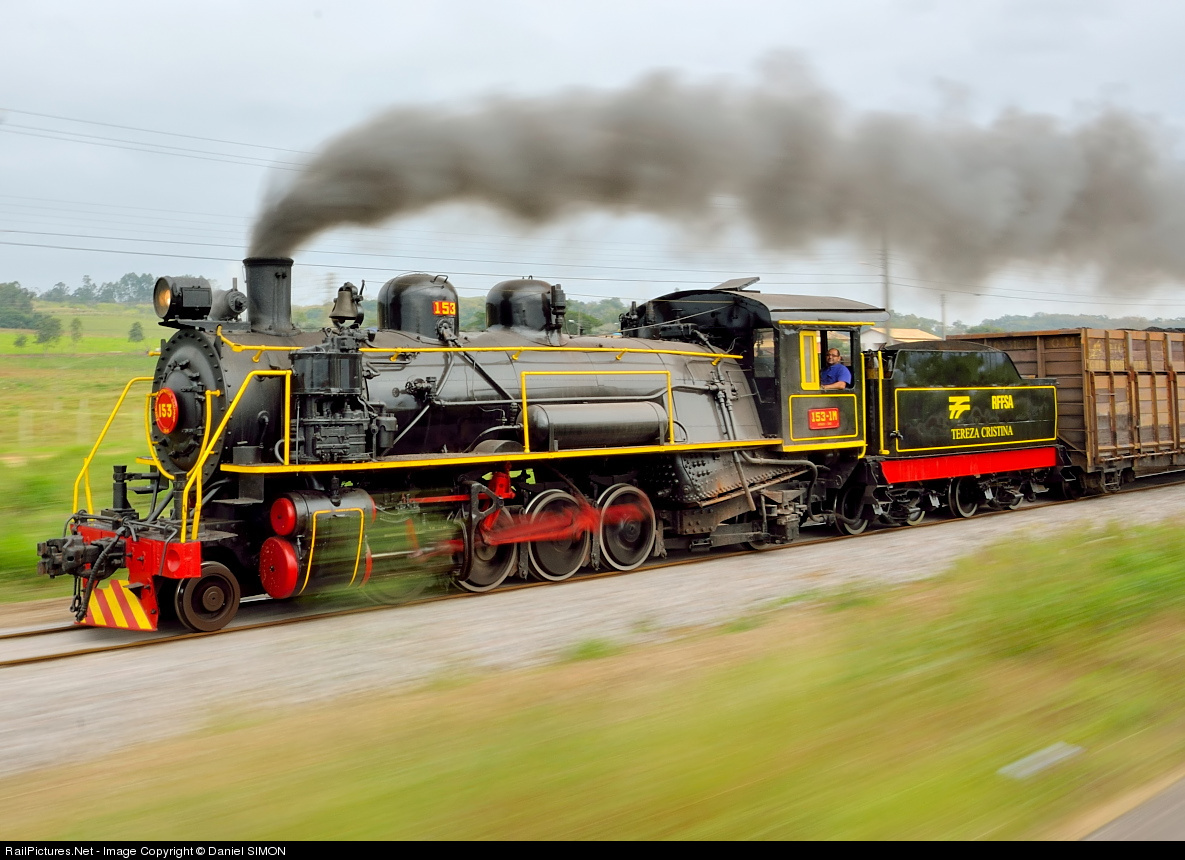 A loaded coal train hauled by the ALCO Mikado 153-1M from the Dona Teresa Cristina railway is running from Urussanga to Tubarao. A Bernd Seiler charter.