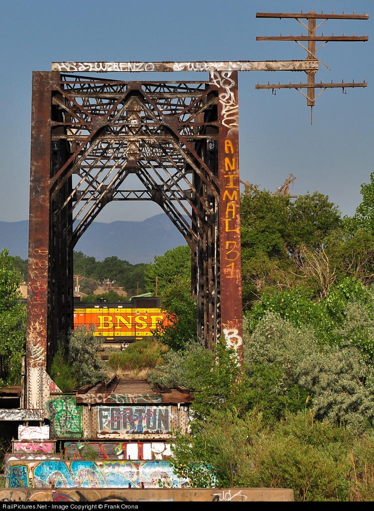 A bridge used by the MoPac on its former mainline into Pueblo frames up the rear DPU on an empty BNSF coal train. Once this bridge used to carry the Colorado Eagle, today it carries the tags of graffiti artists.