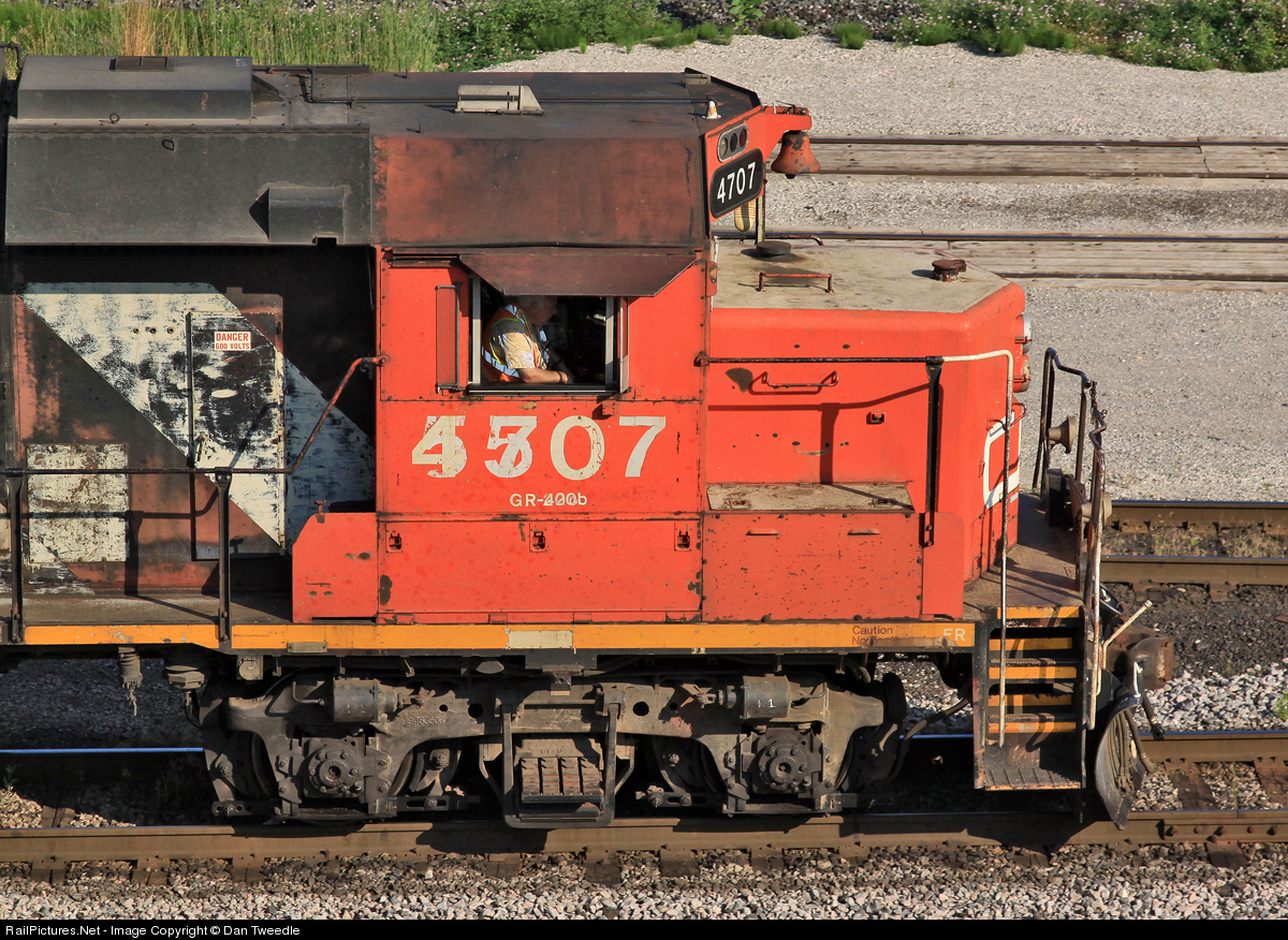 In 1988, CN renumbered a series of GP38-2s from the 55xx series into the lower 47xx series. If you look closely at 4707s number, 5507 is still clearly visible underneath, over two decades later!