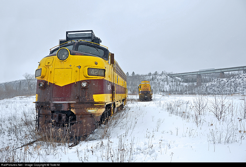 | It's the spring of 2013 and one of two remaining Erie Mining, LTV Mining and now Cliffs Erie Mining F9(A) units still on the property sits along with Erie Mining C420 #7222 in a small yard near where Erie Mining and later LTV mining used to interchange with the former Missabe railroad who brought in supplies to keep the operation running until it closed in 2001 under bankruptcy. |