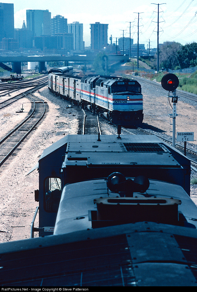 | With LMX GE unit 8531 on the point, BN's Train 196 from the Pacific Northwest to Texas waits in the clear at Fox Junction in Denver for Amtrak No. 5 west to clear on Aug. 19, 1992, back when Amtrak handled express boxcars. Those were usually empty westbound to haul California perishables east on Train 6. (Editorial Note: Photo taken with permission on railroad property) |