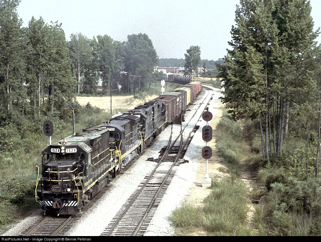 Seaboard Coast Line GP40 #1524, with former Seaboard Air Line paint scheme "Jolly Green Giant" paint showing thru the black, leads southbound train #335. #1524 was built May 1966, on order #7885, as Seaboard Air Line #609. Unit later became Seaboard System #6680, then CSX #6680, then CSX #9727