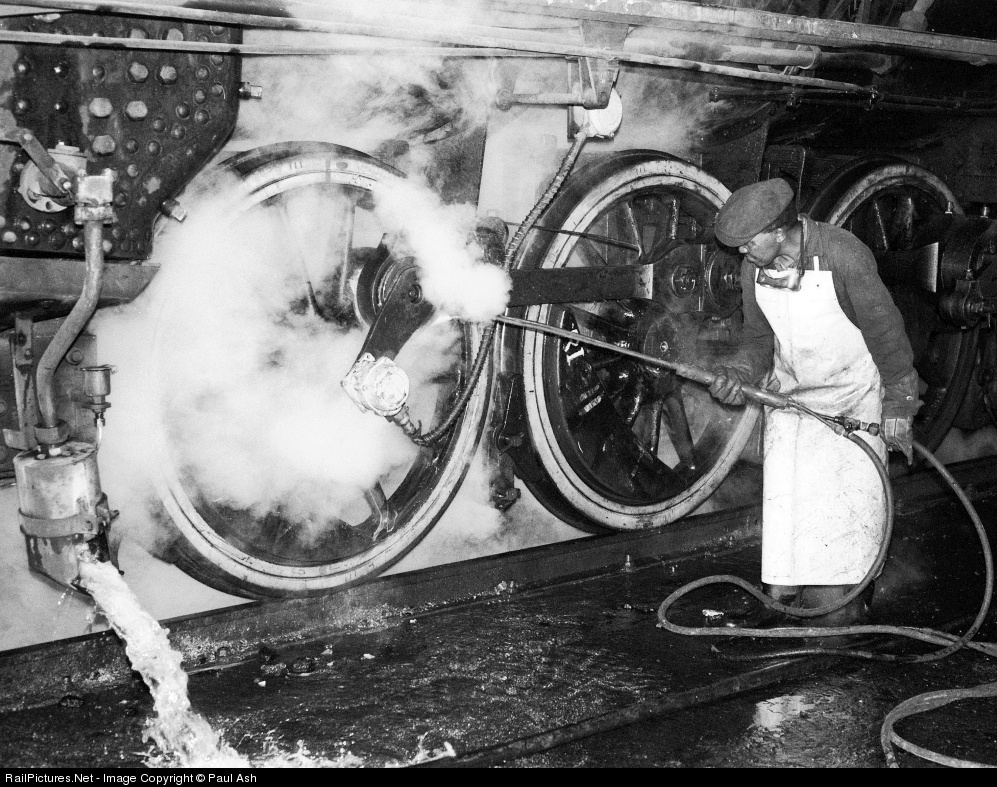 | In the gloom of the running shed at Germiston locomotive depot, an engine hand gets to work with the steam cleaning apparatus on a grimy class 15CA. The loco is in for a boiler washout as evidenced by the water gushing out of the blowdown pipe at bottom left. These ALCO-built Mountains entered service on the South African Railways in the early 1930s and tramped on until the end of steam in 1991. Two have been preserved in working order. |